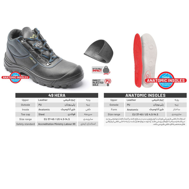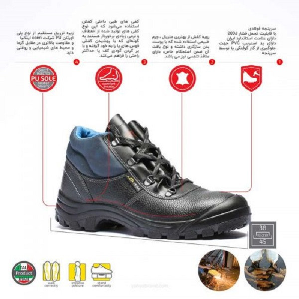 تزریق مستقیم پلی اورتان ( PU ) در زیره کفش های ایمنی یحیی ، ویژگی هایی شامل سبک بودن زیره ، اصطکاک بسیار بالا در سطوح لغزنده و فصل های سرد ، مقاومت بالاتر در محیط های شیمیایی و روغنی ، راحتی و دوام به دلیل خاصیت ارتجاعی و همچنین جاذب ضربه که استفاده کننده نیاز نیاز به ایستادن زیاد و یا راه رفتن طولانی مدت دارد مناسب است . کفی استفاده شده در کفش طبی و ارگونومیک می باشد .